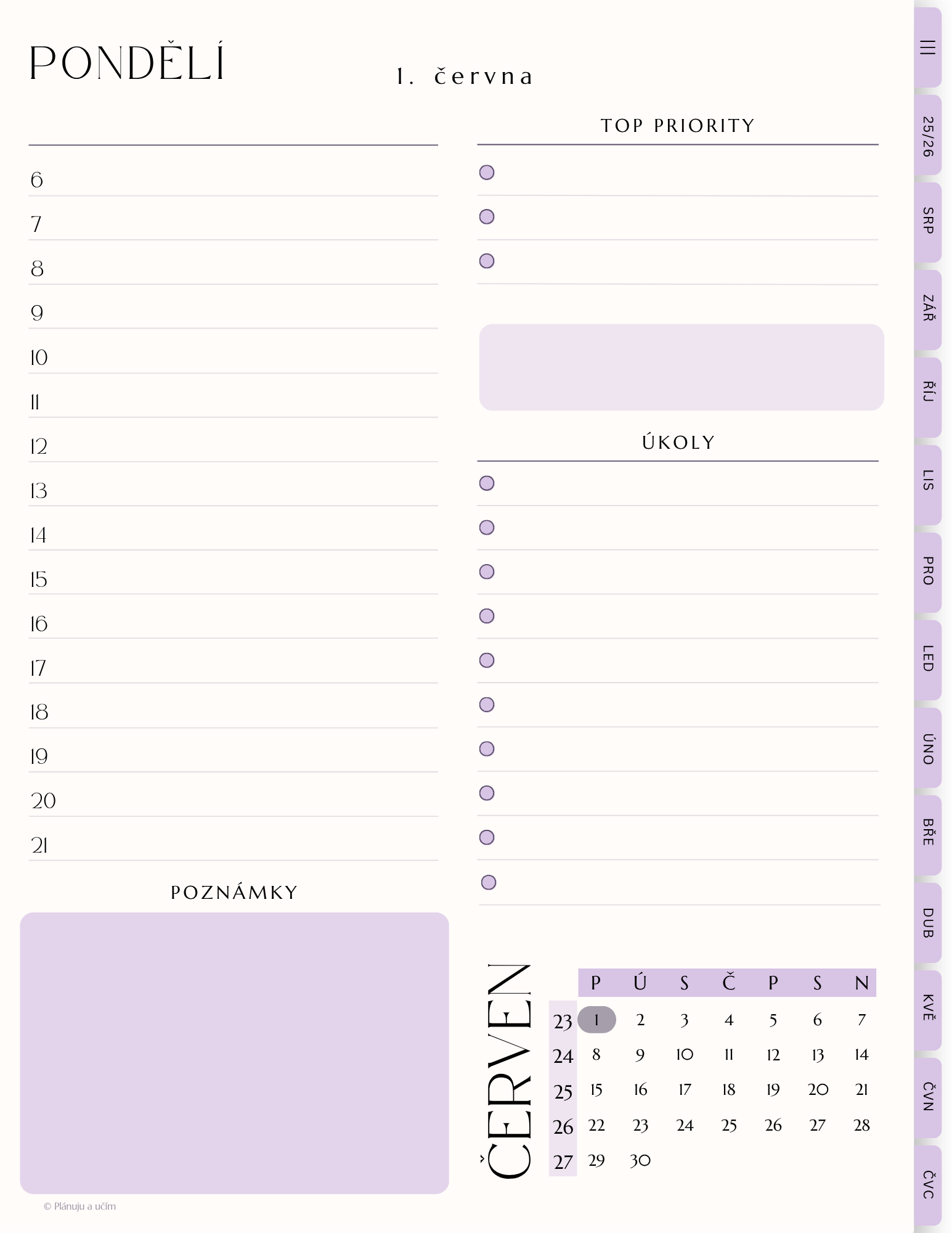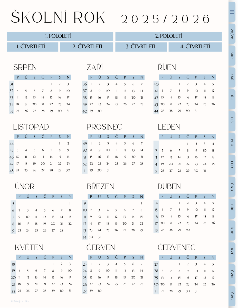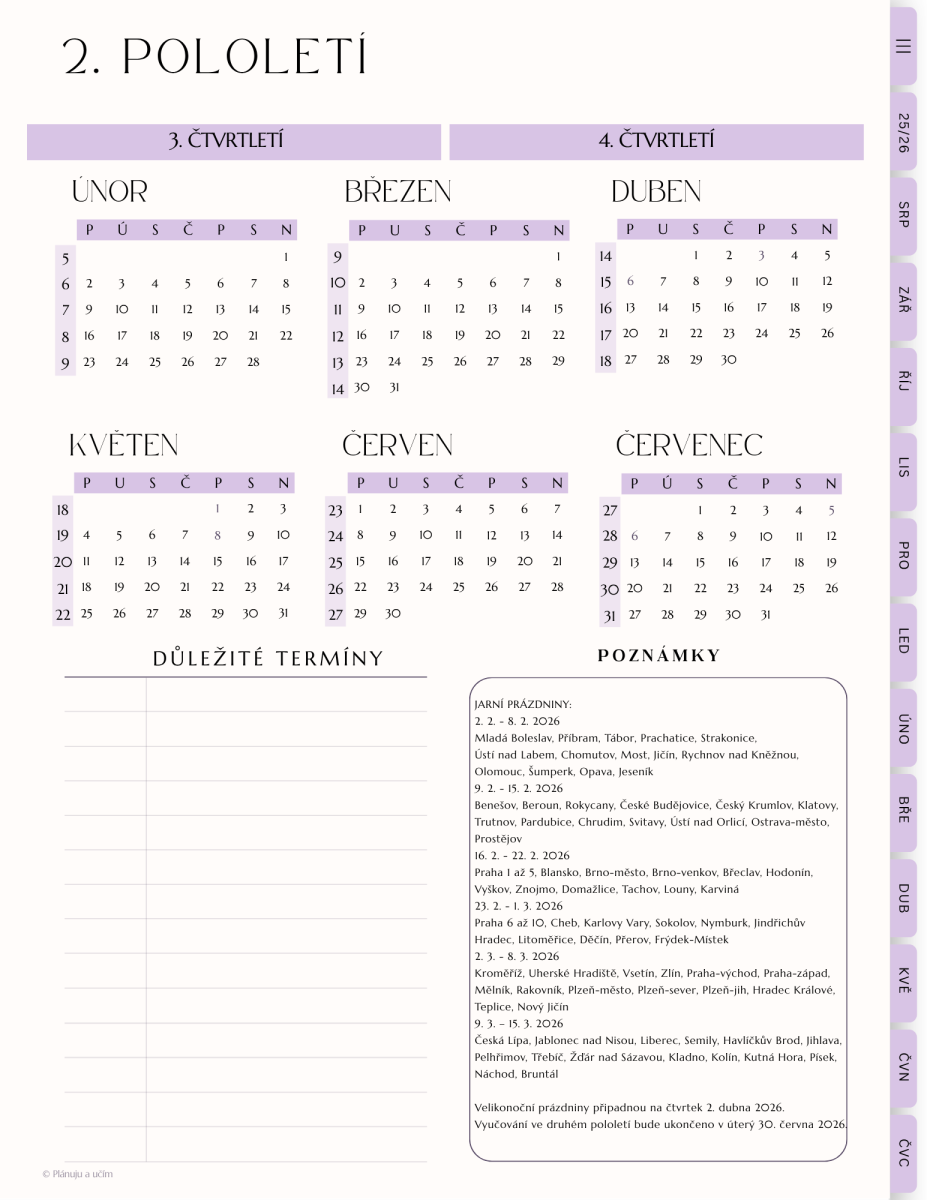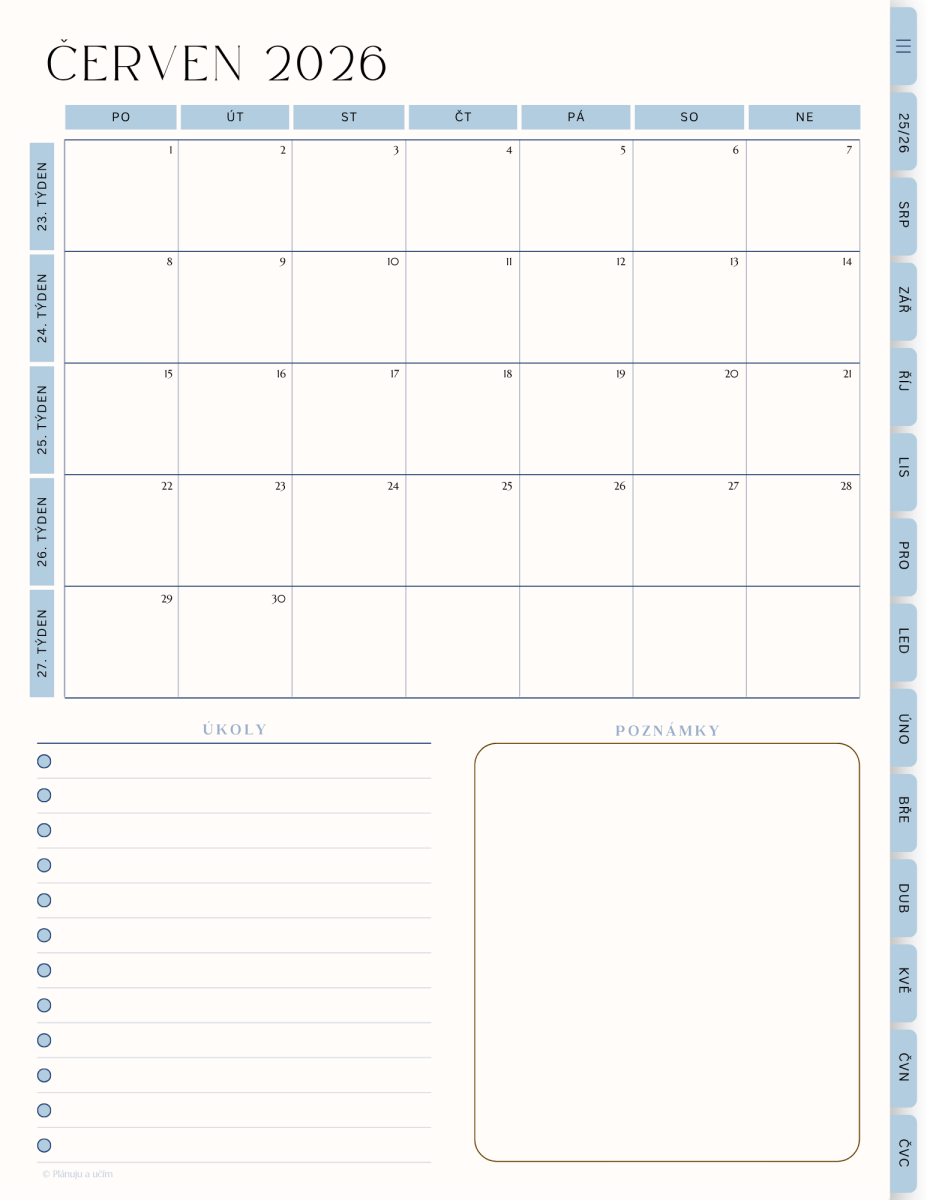 Diář je vytvořený na aktuální školní rok včetně prázdnin. Nyní je v prodeji na rok 2025 / 2026. A to od srpna 2025 do července 2026 včetně.
